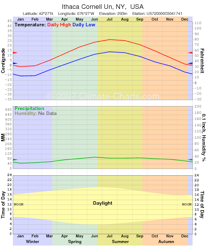 A key factor in determining why a place looks the way it does is the climate. With a little practice, you’ll be able to get a basic understanding of a region’s climate with a glimpse at its climate graphs. Both of the graphs to the left represent the climate for Ithaca, NY.