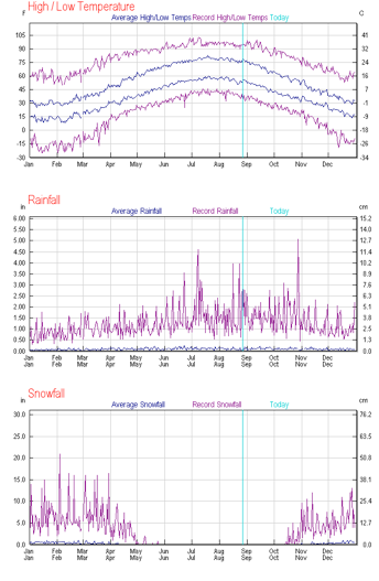 The bottom chart, from Weather Underground, shows record high and lows in addition to averages. These records can be shown or omitted, as can the previous year’s data. Precipitation is separated into two charts, one for rainfall and another for snowfall. The turquoise line shows the date the image was downloaded.