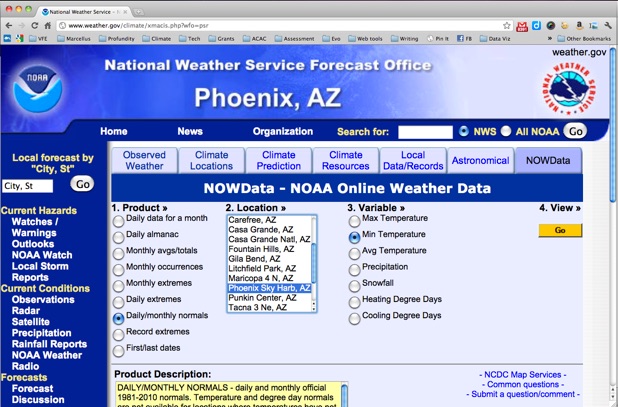 On the NOWData site for your region, select the following: 1. Product >> Select “Daily/monthly normals” 2. Choose the location nearest your field site. 3. Variable >> Select “Min Temperature.” for the low temperature and “Max Temperature” for the high. 4. View>> Click “Go” Record the lowest and daily values.