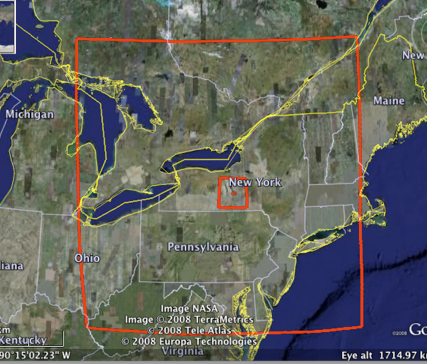 You can cut and paste the text below for labeling boxes. You may wish to add more descriptive text, as is done for the first box. The labels begin with the 100 meter by 100 meter box. The 10,000 km by 10,000 km box can’t be drawn in a practical way as explained below. You may wish to add that text in a placemark placed on Earth’s limb (apparent edge).