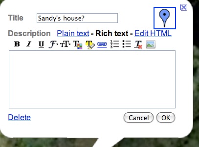 Plugging directly into Google Earth is quicker, but going through Google Maps allows two other advantages -- you can share it with friends and colleagues easily, and allow those folks to collaborate on that Google Map, and you can easily format text in the placemark’s description (what appears in the word balloon).